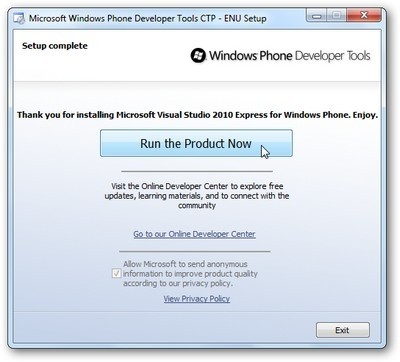 Bây giờ, sau khi Windows Phone Developer Tools đã được cài đặt, trong lần sử dụng đầu tiên, nếu bạn nhấn vào nút Run the Product Now sau khi quá trình cài đặt kết thúc, phần mềm Visual Studio 2010 Express for Windows Phone sẽ tự động được kích hoạt.