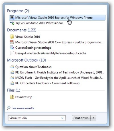 Ở những lần sử dụng sau, để kích hoạt phần mềm, bạn kích vào nút Start, nhập Visual Studio vào hộp thoại tìm kiếm và chọn Microsoft Visual Studio 2010 Express for Windows Phone trong kết quả hiển thị.