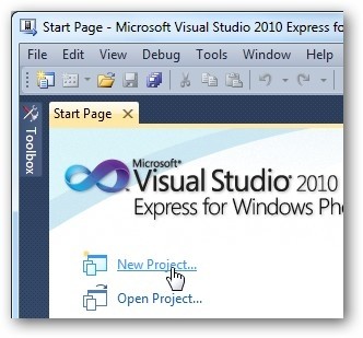 Quay trở lại giao diện chính của Visual Studio 2010 Express for Windows Phone, tại trang khởi động, bạn nhấn vào mục New Project… ở menu bên trái.