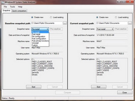 Giao diện của Windows System State Analyzer được chia thành hai khu vực riêng biệt, mỗi khu vực hiển thị một ảnh chụp màn hình của hệ thống tại các thời điểm khác nhau để phục vụ cho việc so sánh.