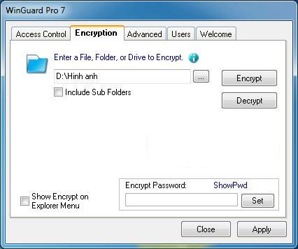 Phiên bản miễn phí của Winguard Pro 2010 chỉ hỗ trợ mã hóa ổ đĩa hoặc thư mục gốc, không cho phép mã hóa các thư mục con. Do đó, tùy chọn Include Sub Folders sẽ không có tác dụng trong trường hợp này.