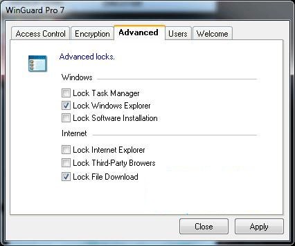 Từ thẻ Advanced trên giao diện chính, bạn có thể đánh dấu chọn các thành phần hệ thống hoặc trình duyệt muốn khóa từ nhóm Windows và Internet tương ứng. Cụ thể: