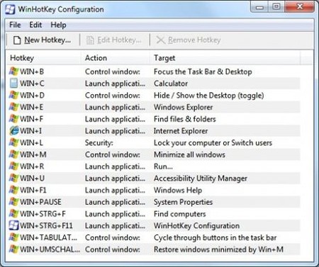 Theo mặc định, WinHotKey đã thiết lập các phím tắt cho các ứng dụng phổ biến như Internet Explorer, Calculator, System Properties… Những thiết lập này có thể dễ dàng được vô hiệu hóa hoặc thay đổi thông qua giao diện của chương trình.