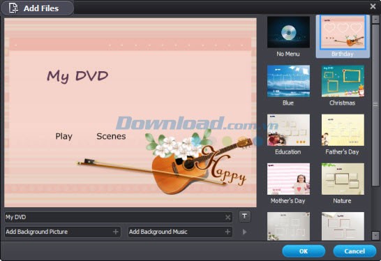 Bước 2: Nhấn tùy chọn “Change template” ở phía bên phải để mở cửa sổ “Burn to DVD”. Tại đây, bạn có thể chọn trình đơn DVD yêu thích, thêm nhạc và ảnh nền đặc biệt.