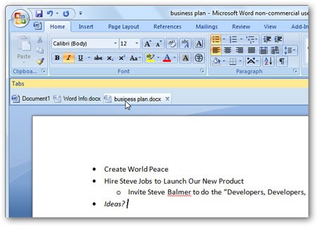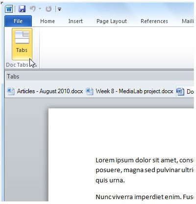 Doc Tabs là giải pháp lý tưởng khi bạn muốn giữ tất cả các tài liệu trong một cửa sổ duy nhất hoặc cần sao chép nội dung giữa hai tài liệu một cách nhanh chóng. Tiện ích này đặc biệt hiệu quả với Word 2007 và vẫn có thể được sử dụng trên Word 2010.