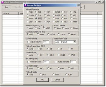 Người dùng có thể tùy chỉnh nhiều thông số khác nhau của tập tin đầu ra trong mục 'Output Options', bao gồm định dạng đầu ra, Audio Sample Rate, Audio Volume, Video Frame Rate, Bit rate, Audio Encoder và Video Encoder.
