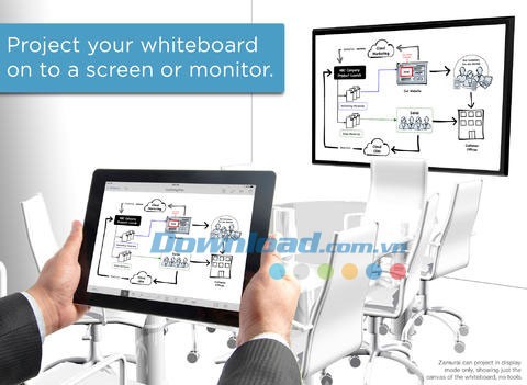 Ý tưởng của bạn được thể hiện ấn tượng trên Zamurai Mobile Whiteboard. Nhưng chúng sẽ hiệu quả hơn khi được trình bày trong các cuộc họp. Chia sẻ ý tưởng trong cuộc họp hoặc lưu lại cuộc thảo luận trong thời gian thực. Với chế độ Whiteboard Only, người dùng khác sẽ không thấy bất kỳ thanh công cụ, bàn phím hoặc thư viện nào. Bạn có thể kết nối không dây tới màn hình lớn thông qua Apple TV hoặc AirServer hoặc Reflector. Bạn cũng có thể sử dụng bộ tiếp hợp Apple VGA, DVI hoặc HDMI chuẩn để kết nối trực tiếp tới màn hình lớn hoặc máy chiếu.